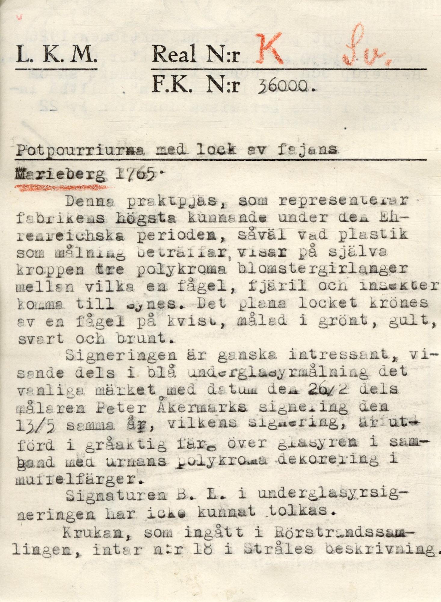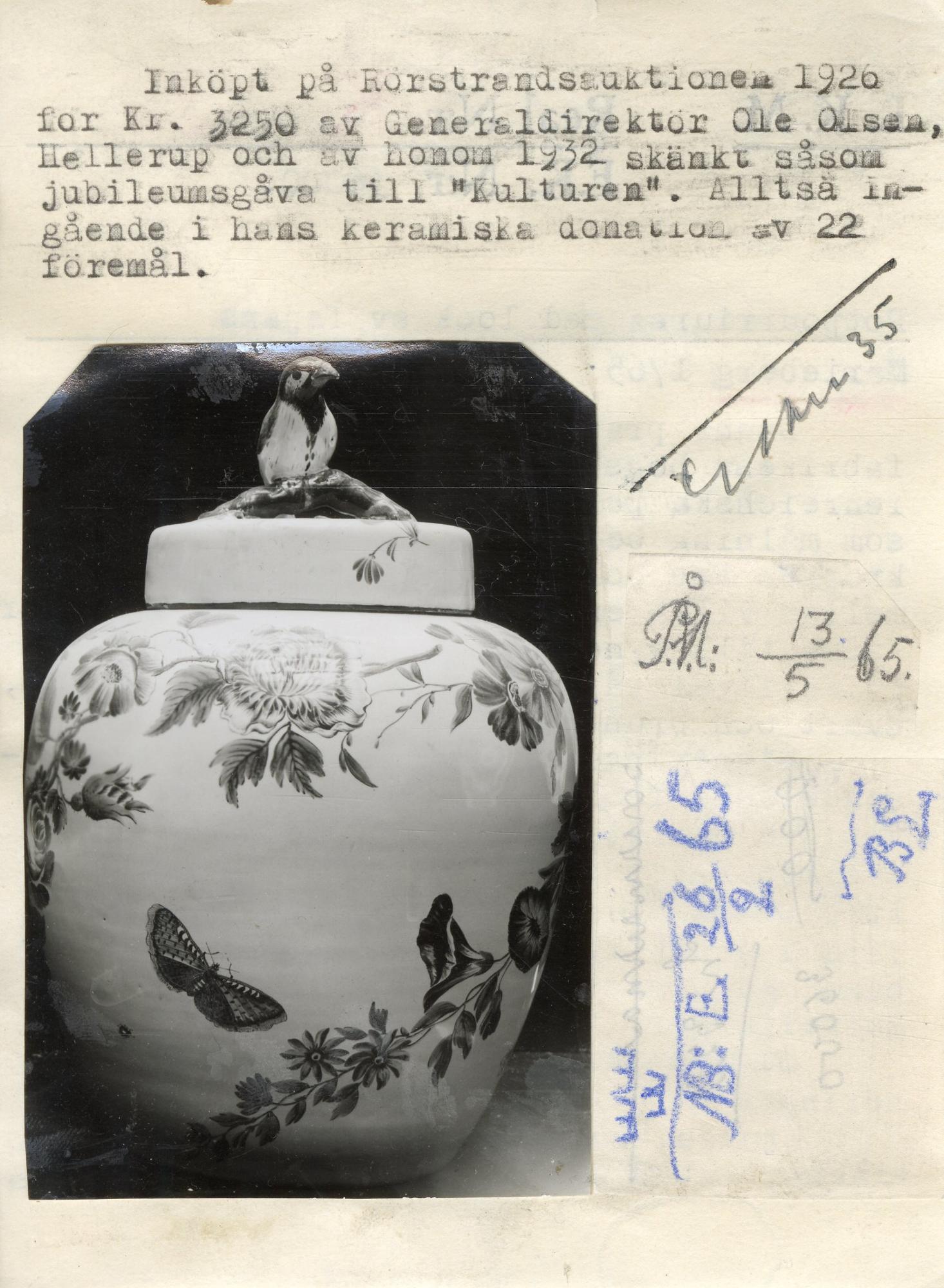 - Dekorerad med blomstergirlangen av manganfärgade och gula rosor, lysande blå strassburgsblommor och små blommor i lila och blått. Bladen har en grågrön nyans. Mellan slingarna är fåglar och fjärilar. Locket är platt har en naturalistiskt formad och målad fågel på en kvist som knopp.