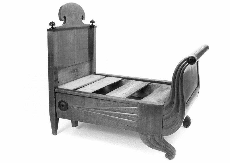 - Huvudgaveln rak med profilerat överstycke, fyrkantiga hörnstolpar med halvrunda knoppar av mörkare trä, nedåt avsmalnande fyrkantiga ben. Fotgaveln lägre och s-formigt svängd, liksom benen, insidan klädd med grönt tyg. Långsida, framsidan gavelkant och framben dekorerade med skurna mönster samt rundlar i mörkare trä. Botten av säckväv med träram.
