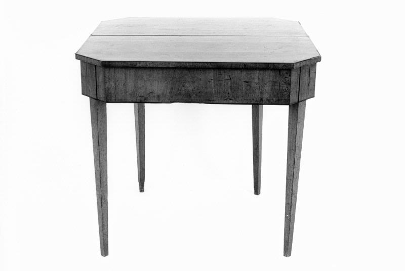 Fyra raka ben varav ett vikbart. Bakom detta i sargen, en draglåda. Tvådelad, vikbar skivad med avfasade hörn.