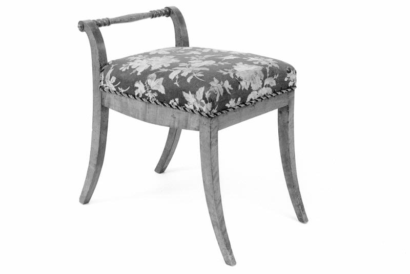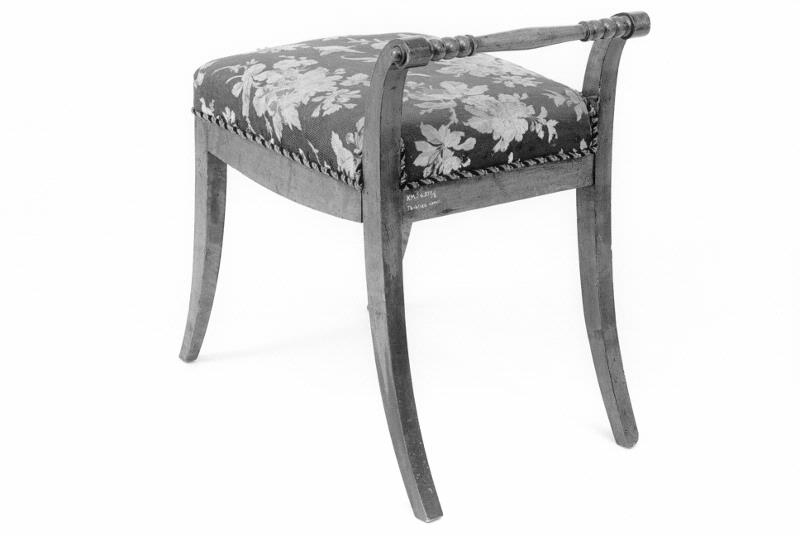 Rektangulär sits, fyra sabelformade ben varav två fortsätter upp i ett lågt ryggstöd i form av en svarvad stav. Fast stoppad sits klädd med tyg i polykromt blommönster på brun botten. Polerad björk.