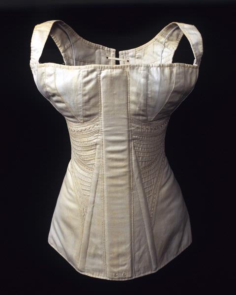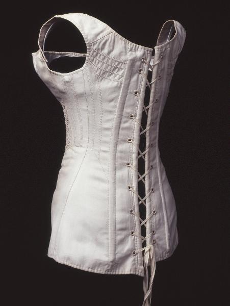 "Snörlivet sett från sidan. 1810-1820.; "Snörliv av vitt bomullstyg, s.k. engelskt skinn, med dekorativa stickningar i gult silke, som också ger stadga. Det har en ficka för en planschett mitt fram, snörs bak och har valben på var sida öppningen. Korsetten har tillhört Emelie Meijer (1817-1890) som ung flicka eller hennes mor Christine Meijer, Karlshamn 1810-1820." UNDERKLÄDER, En kulturhistoria.