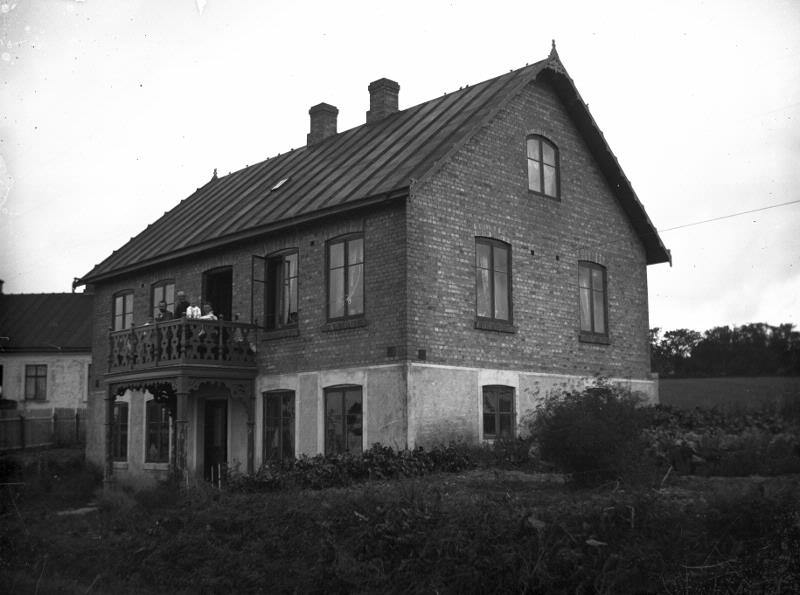 Exteriörbild. Foto på en familj stående på balkonge till ett hus. Dalby. Okänt år.