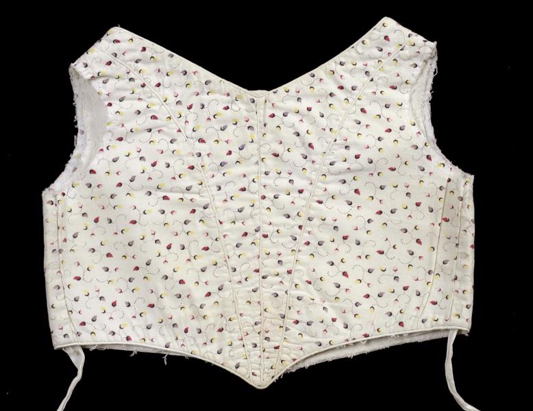"Klänningsliv, barn. Småmönstrat tryckt mönster. Hyskor och hakar samt kjol och ärmar bortsprättade. Ca 1820."