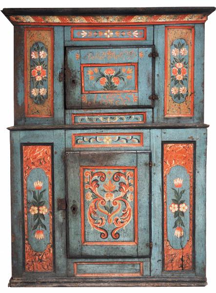 "Vi vet ingenting om mannen och kvinnan bakom initialerna, men vi vet att den 29.9 var en tisdag i höstmånaden och att Michael hade namnsdag. Det var alltså Mickelsmäss - en höjdpunkt under det gamla bondeåret. De anställda hade då möjligheten att flytta och ofta en frivecka. Kanske passade man på att fira bröllop då? En Fraktsedel på baksidan berättar om skåpets vidare öden - 'A. Christenssons lump & skrotaffär Från Eslöv till Herr Carl Paulsson Råbyg Lund". Utställningstext Folkkonst Design