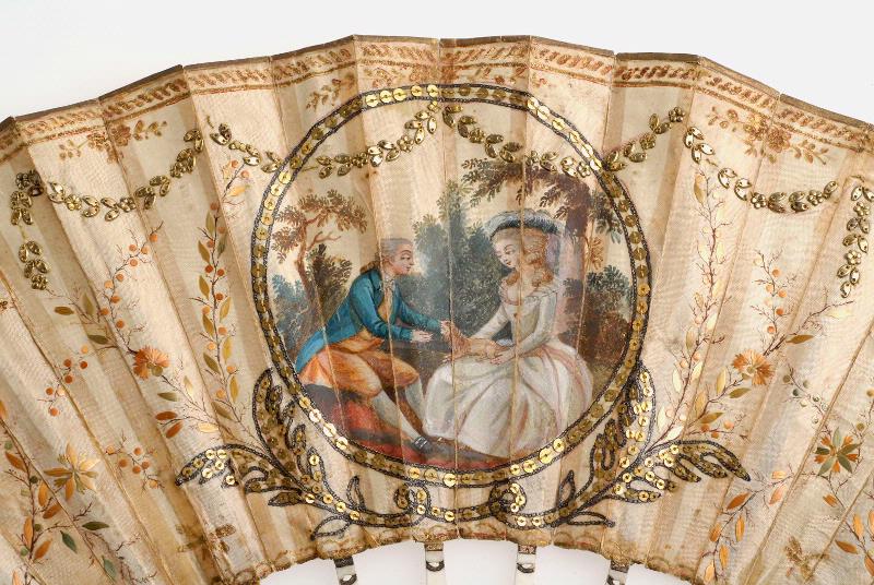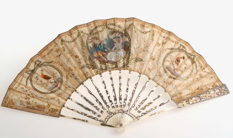 - Av vitt siden. Mittkartusch med älskande par i 1700-tals dräkt, framställningen målad. Sidorkartuscher med fåglar och insekter i målning och applikation, fåglarna är lagda av kulörta detaljer av fjädrar liksom vingarna på insekterna, blommor och blad på grenarna av olikfärgad halm. Kartuschramarna är sydda, liksom grenverket under mittkartuschen, av silvertråd i kedjesöm och däremellan guldpaljetter. I övrigt omramande grenverk målat med blad och blommor i olikfärgad halm, bårderna i guld och rött. Baksidan med enkel bård i rött. Ställ av elfenben med nedpressade mönster i staniol, med spår av guld. På skalmarna genombruten dekor med staniolbeläggning i guld och silverfärger mot pärlemorlustrerad fond. Stället sammanhållet nedtill med en bronsten med glaspärlor. Lagad.