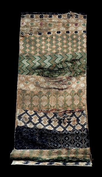 Bottenbårder i grått, gråbrunt, grönt, blått. Mönsterfärger: mörkblått, vitgrått, gråbrunt, grönt, ett par röda blommor. Mycket trasig på mitten. Fodrad med linnetyg.