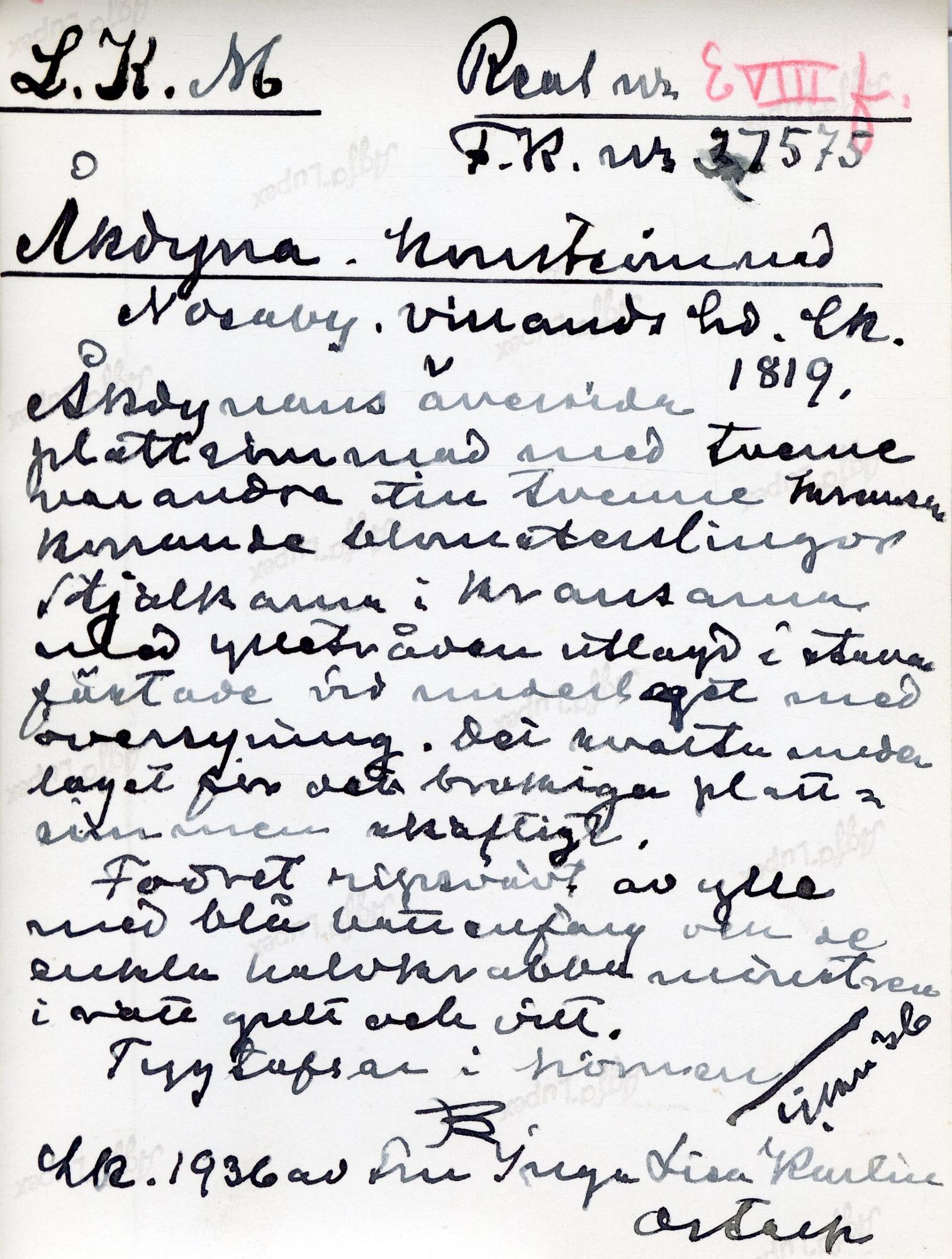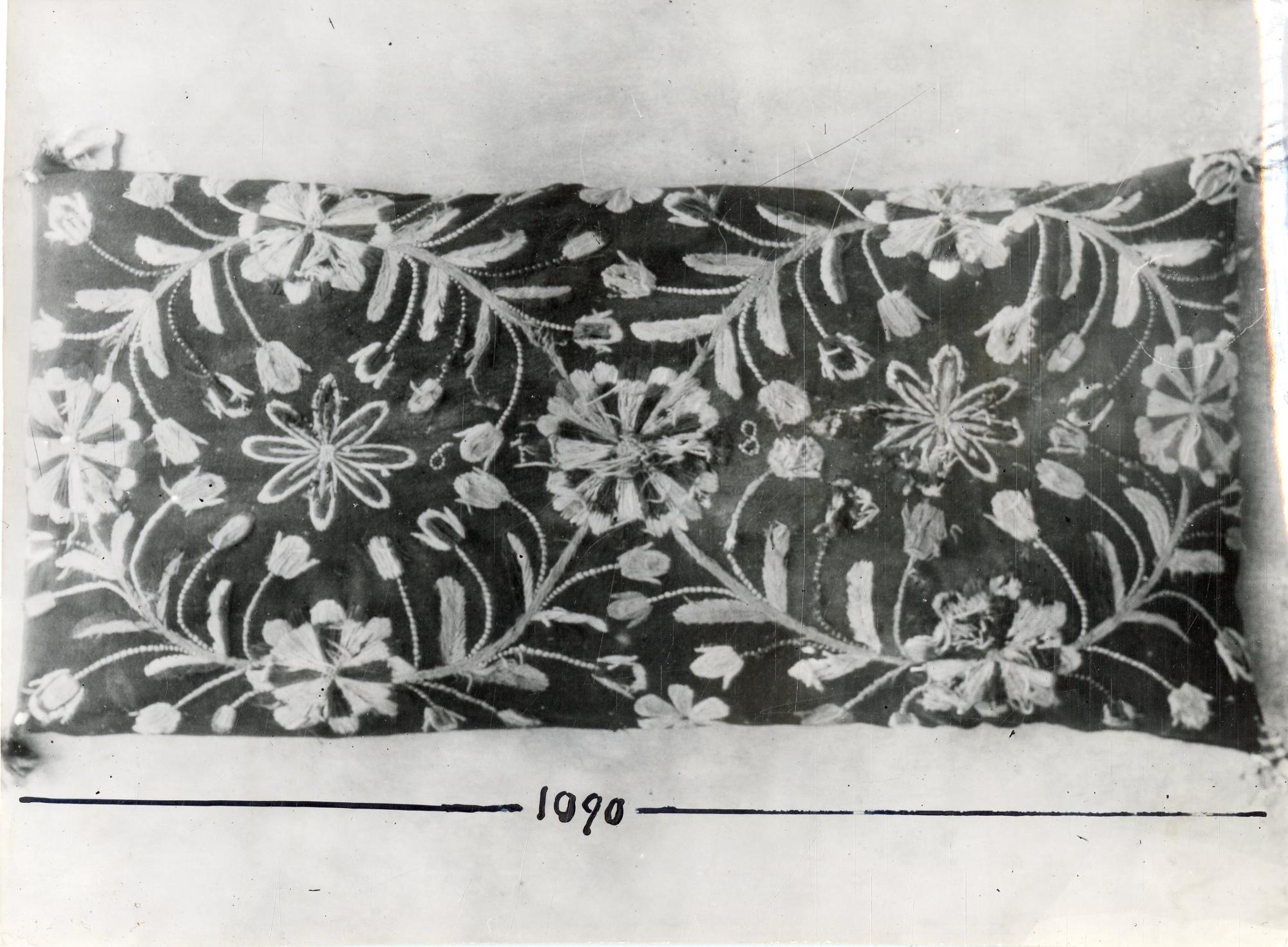 - Polykromt broderi med tvinnat ullgarn på svart ylle, tuskaft. Färg: vitt, ljusblått, rött, rosa, ljusrött, gult, grågrönt, grågulrosa. Motiv med blommor och kransar. Hörntofsar av bomull, linne och sidenband. Baksida i blå yllerips med (tvistrutor) randiga rutor i halvkrabba, gula, gröna, vita, rödbruna. Stppad. Randigt dynvar.