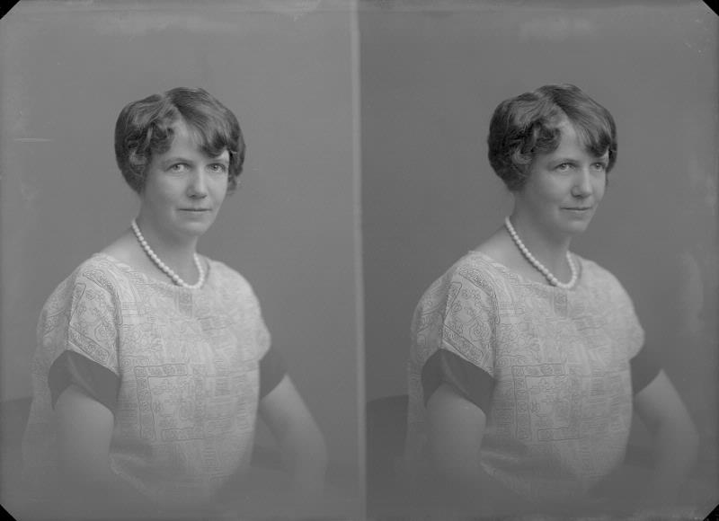 porträtt; person; kvinna; klänning; frisyr; halsband; pärla; pärlhalsband; stol