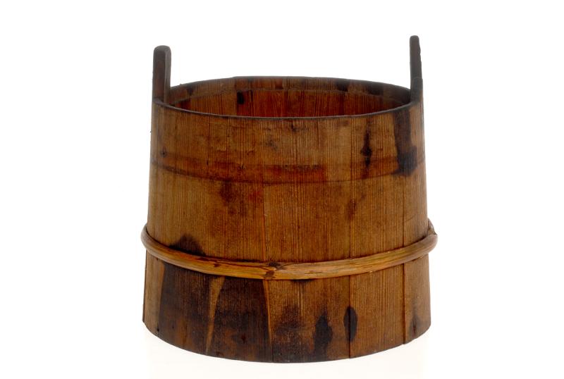 Rund, av gran laggad med band av en. Locket borta. Två motsatta stavar längre än de övriga, ha utgjort fäste för locket. På den ena inbränt: JNS.