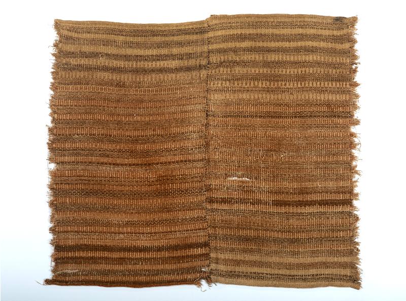 Bunden rosengång, 3-skaft. Varpen i 2 trådigt, S-tvinat lingarn, 22 trådar/10 cm. Inslag i fårull blandat med nöthår, lingarn ev. skäktefall? 4-5 cm breda tvärbårder. Färger; naturgrå och brun ull, ljust lingarn. Mittsöm. Trasig, mycket sliten. Vävbredd: 70 cm.