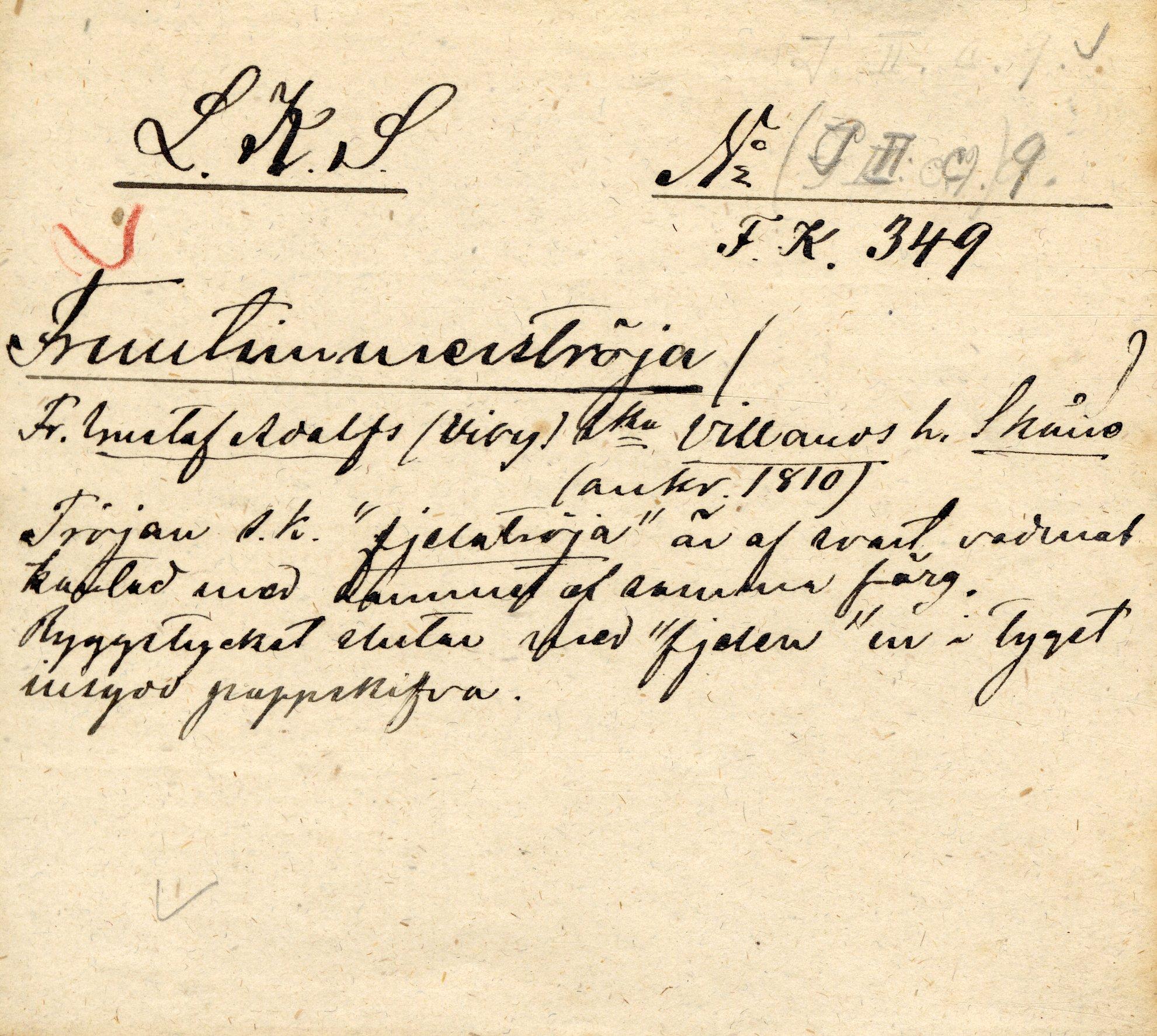 - Svart vadmal. Kantad med svart sammet. Ryggstycket slutar med fjelen [alt. fjälen], en i tyget insydd papperskiva. Knäppt med nio hyskor och hakar av mässing. Foder av naturfärgat blågarnstyg och blått ylle. Framkanterna fodrat med rostfärgat, luddigt ylletyg, nederdelen av fjelen med klart tegelrött ylletyg. Äldre tröjor fogades samman via ryggsömmar och saknade mittsöm bak. I södra och östra Skåne var tröjorna kortare i livet och av mer ålderdomligt snitt än de i västra och norra Skåne.