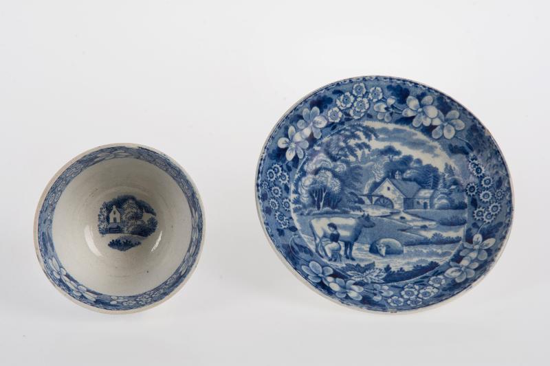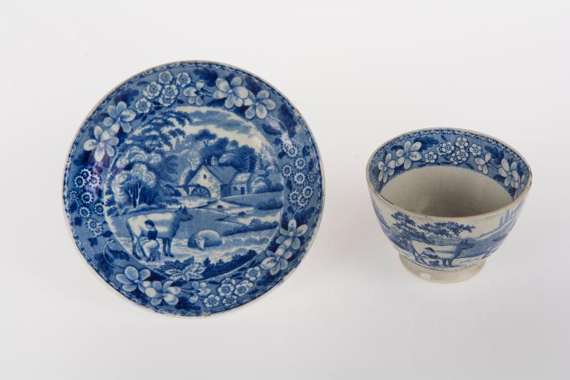 Tryckt blå dekor på utsidan lantliga landskap med kvarn och ko som mjölkas, inuti bred blombård. Vid inventering 1976 återfanns endast koppen.