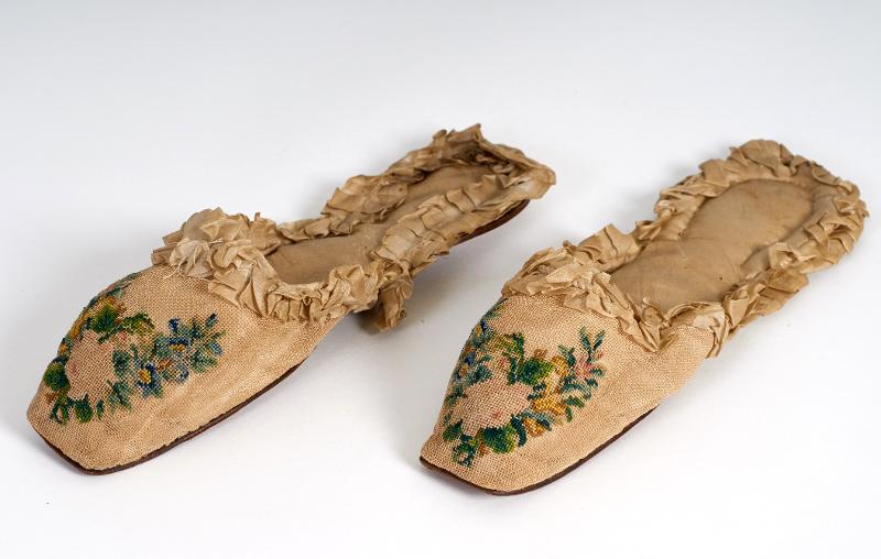 Med polykroma broderier på stramalj och vitt sidenfoder. Kantade av veckat siden och en silkesnodd. Defekter: innersulan lossnat från lädersula.
