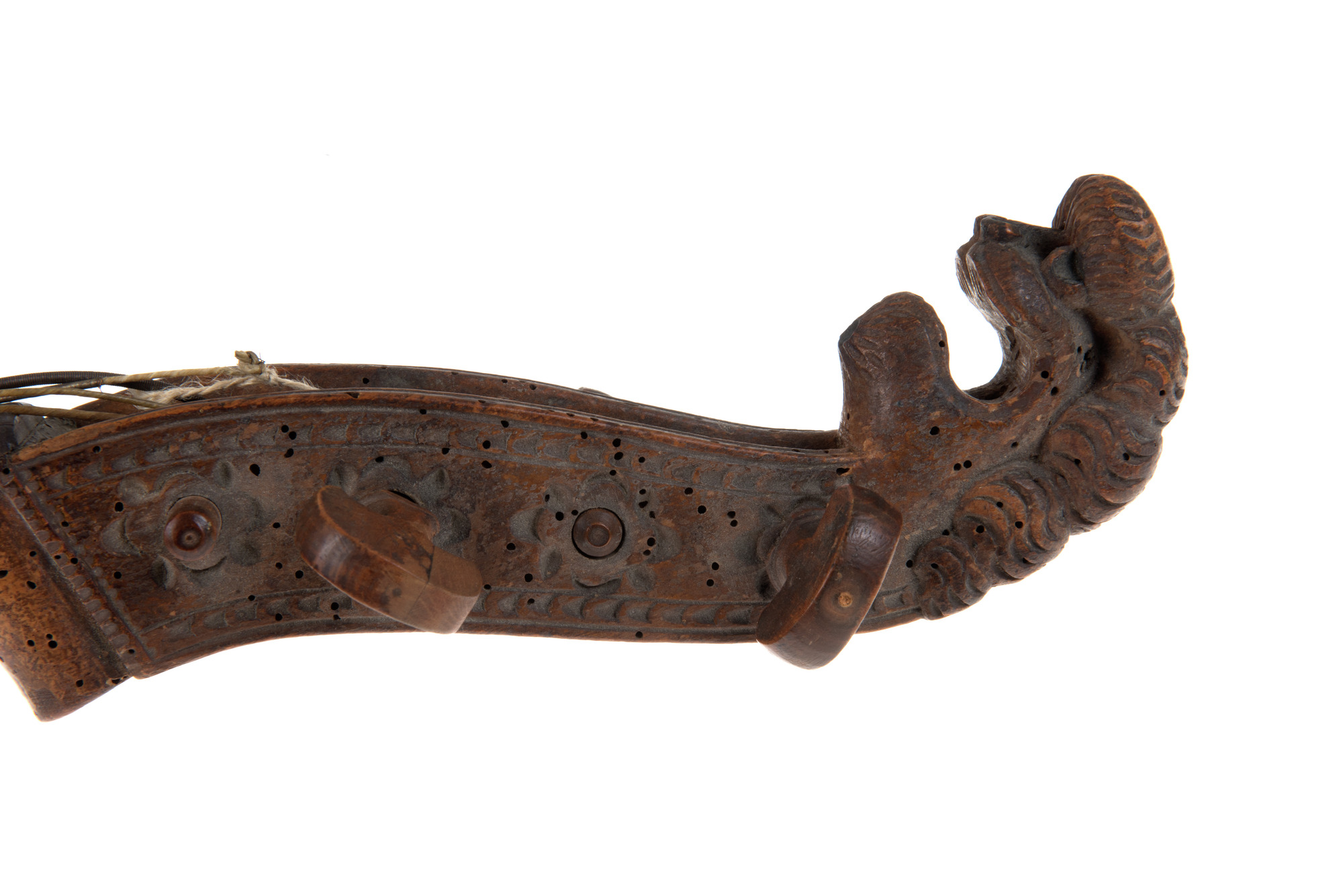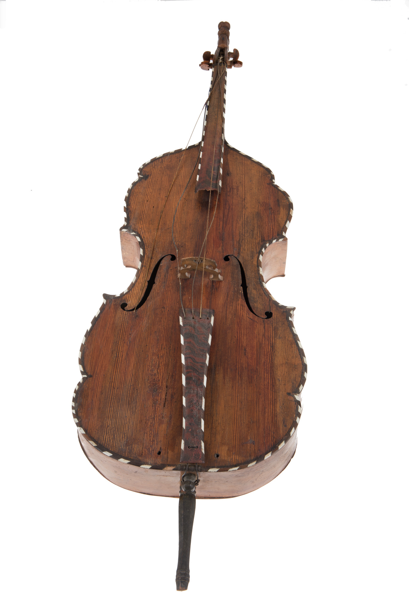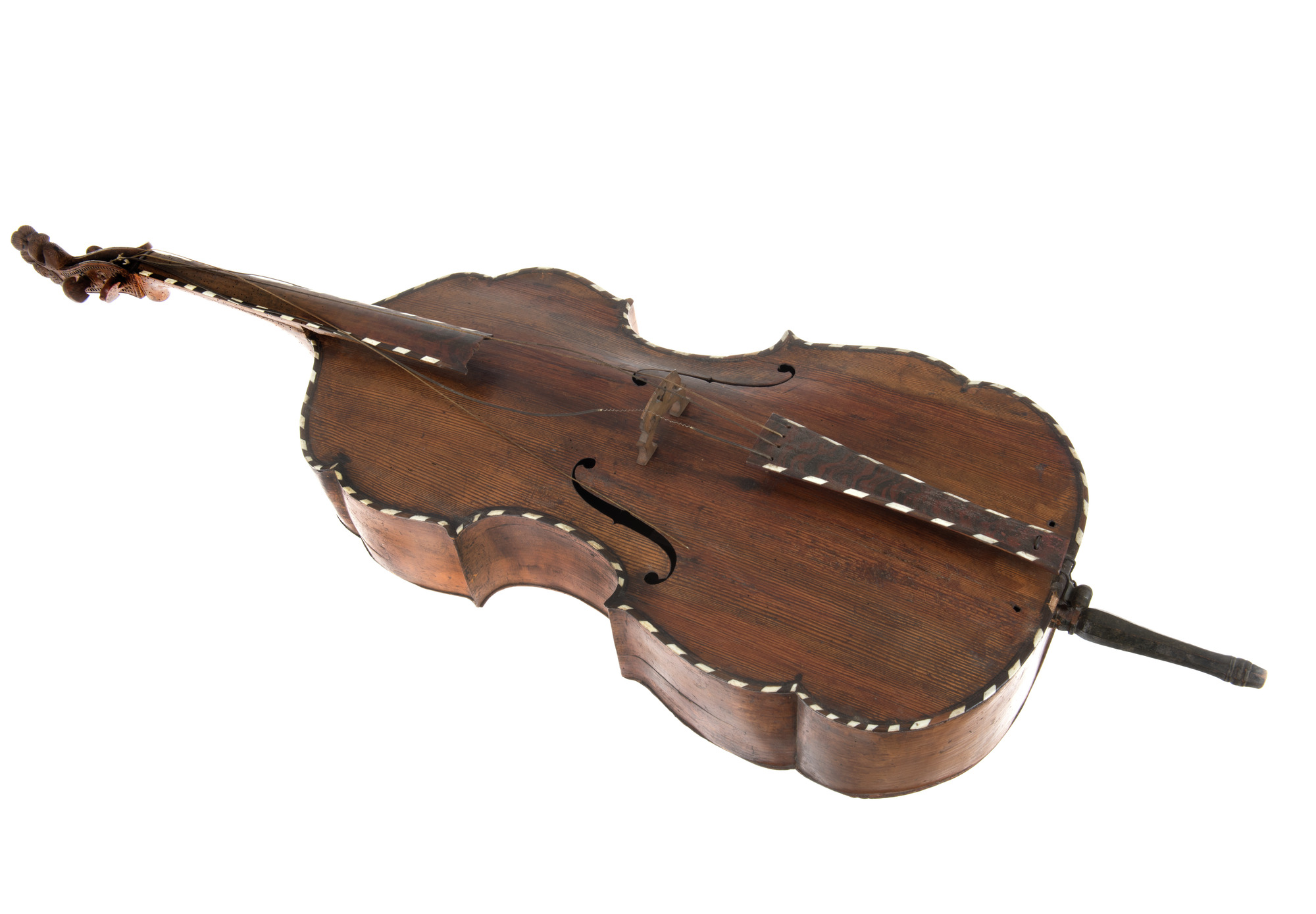 "Violoncell tillverkad 1751 av Johan Mohte i Engelholm. Mohtes instrument har en avslutning i halsen i form av ett lejonhuvud, en något rustik ornamentik i kvardröjande barockstil."
