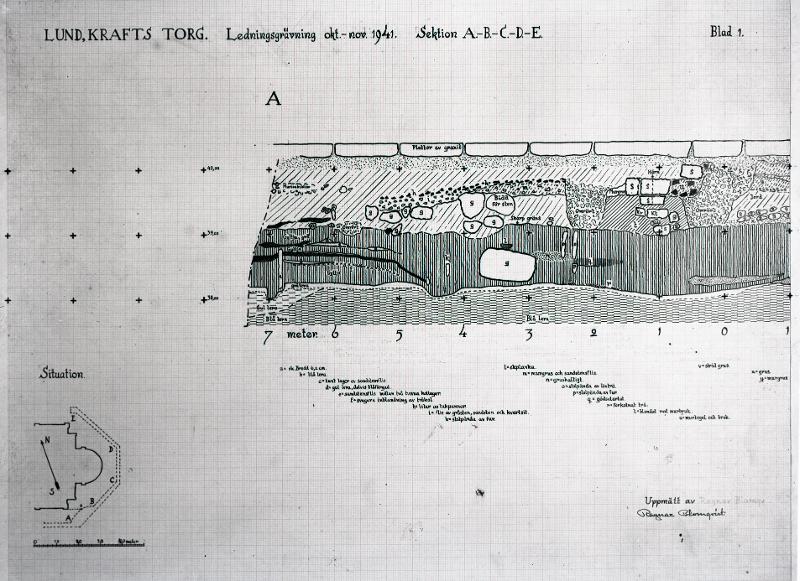 Lund. Krafts torg. Ledningsgrävning okt.-nov. 1941. Sektion A-B-C-D-E. Blad 1.