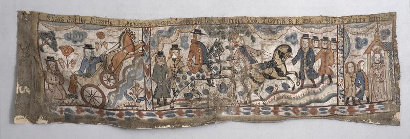 - Motivet framställt i en bildrad; från vänster till höger: Elias himmelsfärd, Absalons död och bud därom till Kung David. Textremsa, svart text mot gul botten i ovankanten: "Eliias for the Himmla 2 konünga. B. 2. cap Joabs här Absalons. dööd 2. samels. B. 18. Cap.", "Bü för konüng. dawid." Motivet i orange, gråblått, blått, brunt, brunrött, grönt, gult, svart och vitt mot vit botten. Färgbortfall, fransig i nederkanten, kanterna förstärkta med nytt linne, rostangrepp och hål efter häftstift och spik, fuktskador.