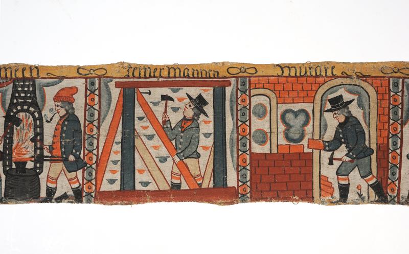 - Motivet framställer i tolv fält tolv olika hantverkare i sitt arbete. Från vänster: skräddare, skomagare, koparslagare, hattamagare, swarfware, mållare, snekare, smeden, timmermannen, murare, bökare, och julare. Vit botten med motivet i tegelrött, brunrött, gråblått, grönblått, gult, grått och svart. I högra änden en oblekt knuten och flätad frans. Tillverkad av Johannes Nilsson i Gyltige eller Per Nilsson i Ljushult.