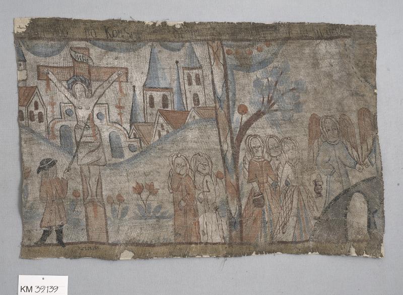 - Motiv; till vänster framställes Jesu död på korset. Av överskriften kan endast tydas: "-död på korset". I det högra fältet: "de tre qw(innorna) som gå åt graf(en)". Målat i orange, blått, gult, rödbrunt, grått, svart mot gråvit botten. Beskuren i båda ändar. Visst färgbortfall. Signering och märkning: ANNO 1808 A E