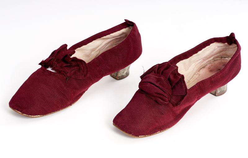 - Vinrött siden. Rips med stor, rynkad tvärslå; alk(plym) plös. Försilvrad, svängd klack. Linnefoder och vitt skinn i botten. Lädersula. Korta hankar av samma tyg i bakkappan. Mått: klack H 4 cm, Br 2,2 cm. Defekter: tvärslån fattas på ena skon; försilvringen till stora delar borta på klackarna.