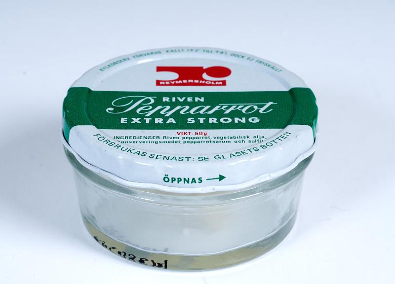 - Cylindrisk förpackning med tryck i grönt och rött. På locket finns Reymersholms logotyp i rött, och under den ett grönt fält med texten: RIVEN Pepparrot EXTRA STRONG. Runt lockets kanter "Kylkonserver förvaras kallt (+2° till +8°) dock ej fryskallt" samt "Förbrukas senast: se glasetsbotten". Vikt 50 g. På glasets undersida en vit etikett med datum 020974.