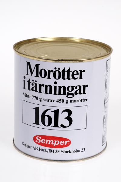- Cylindrisk förpackning med tryck i rött och svart på vit botten. På ena sidan texten: Morötter i tärningar: Vikt 770 g varav 450 g morötter. Under texten finns numret 1613 inom en rektangulär ram, och under detta Sempers logotyp samt "Semper AB, Fack, 10435 Stockholm 23". På andra sidan ett likadant tryck.