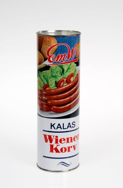 - Cylindrisk förpackning med tryck i flera färger. Den övre delen upptas av ett fotografi av wienerkorv, tomat i klyftor och salladsblad på ett fat. Ovanför till vänster syns en korg med franskbrödbullar och till höger en glasburk med senap. På bildens övre del finns Emwes logotyp. Under bilden står: KALAS Wienerkorv. På förpackningen finns också en varudeklaration och anvisning om tillagning samt inom cirkel "EmWe LIVSMEDEL MALMÖ WIENERKORVFABRIK AB *För högsta kvalite*".