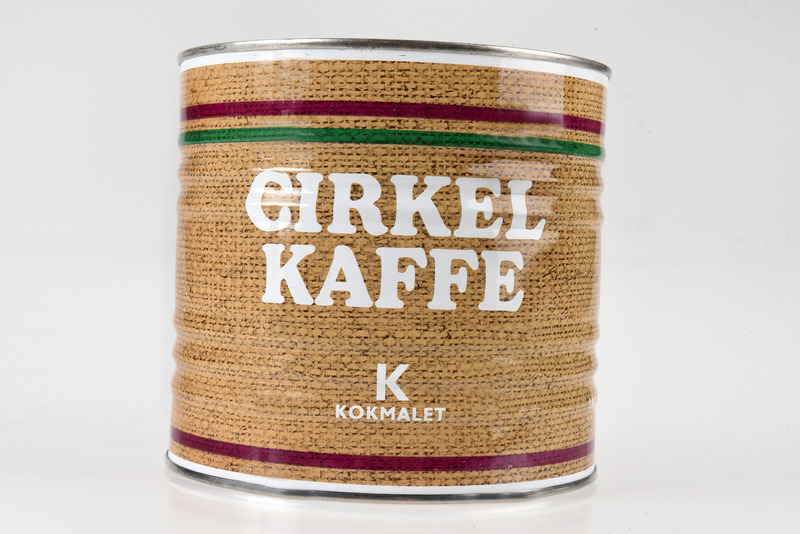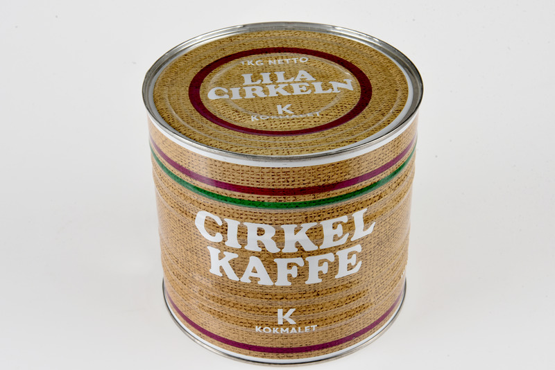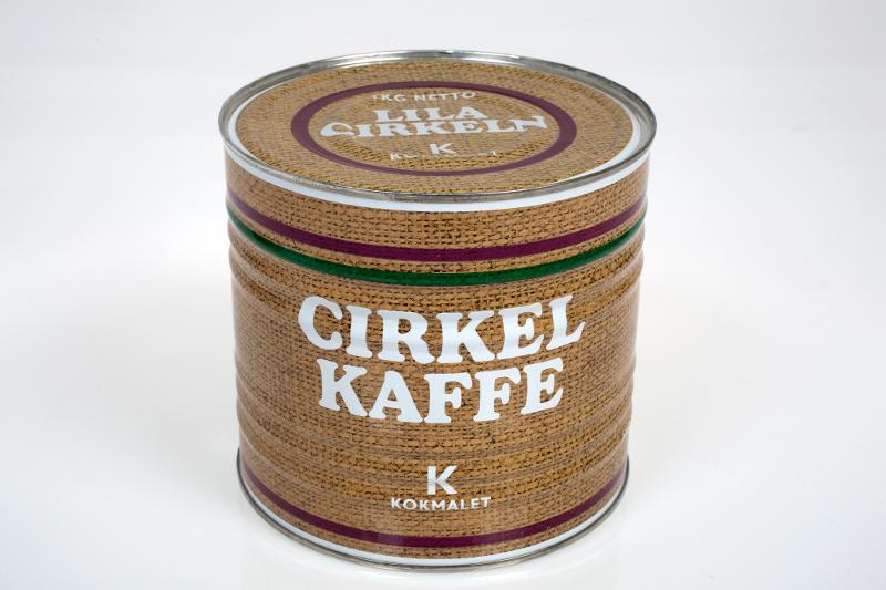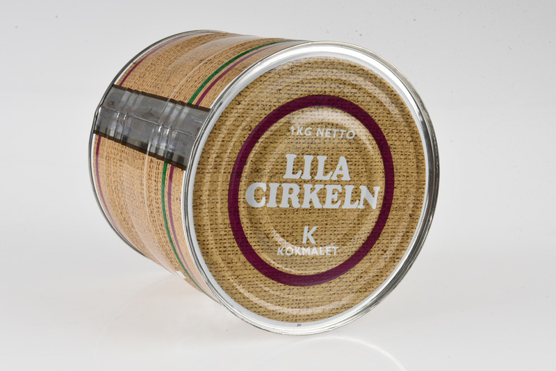 - Cylindrisk förpackning med tryck i vitt, grönt och lila. Bottenfärgen utgörs av ett fotografi av juteväv på sidan och på locket. På två sidor texten: CIRKELKAFFE K KOKMALET. På locket texten: 1 KG NETTO LILA CIRKELN K KOKMALET.