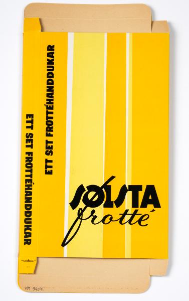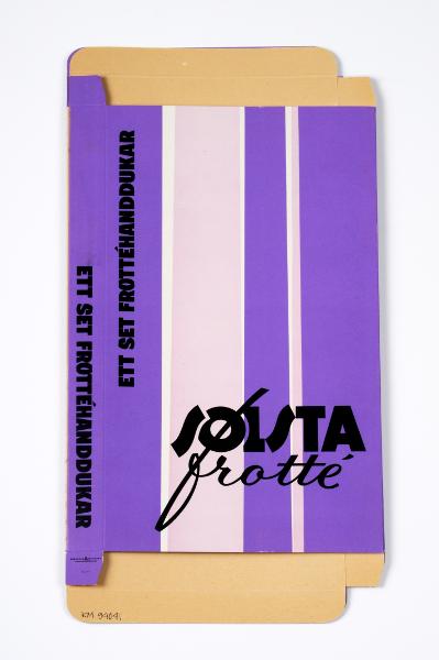 Förpackning för frottéhanddukar. Dubbelkartong / två kartonger som sitter ihop. Dekoren randiga samt med text. På ena sidan står med svart text: SOLSTA frotté.På motstående sida står i tre likadana tryck: ETT SET FROTTÉHANDDUKAR. En sida med utsparat fönster över vilket det sitter en plastfilm. Den ena kartongen är randig i lila toner och den andra i gula toner.