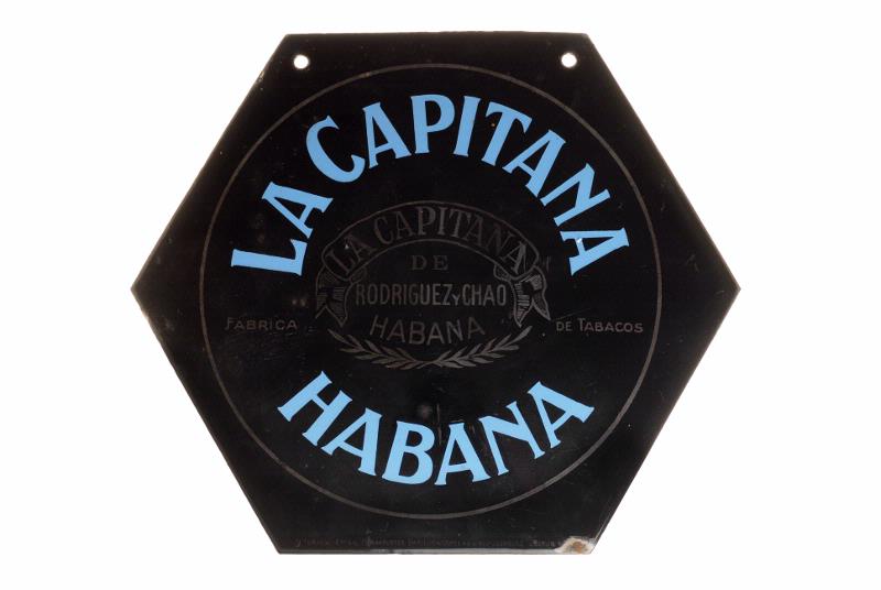 [katalogkort saknas 19990317] avsedd för cigarrmärket, 6-kantig, med texten i blått och gult på svart botten.