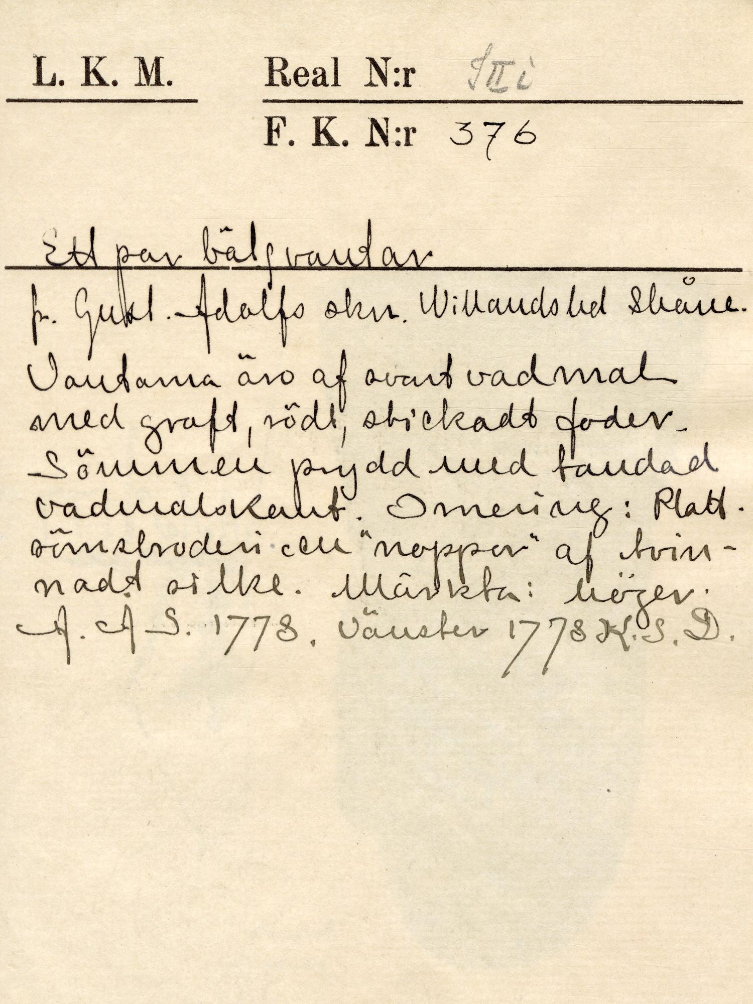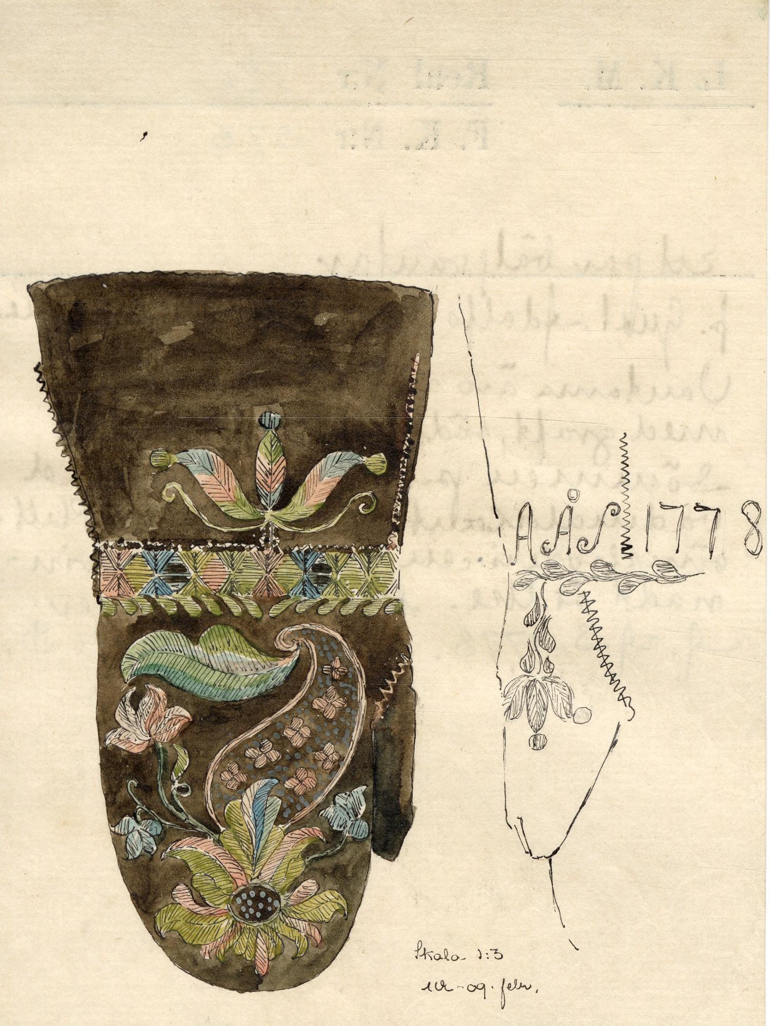 Svart ylle, rött yllefoder. Broderi i grönt, blått, gult och ljusrött på utsidan och på tummen. Blekt i färgerna. Monogram: AÅS 1778, 1778 KSD