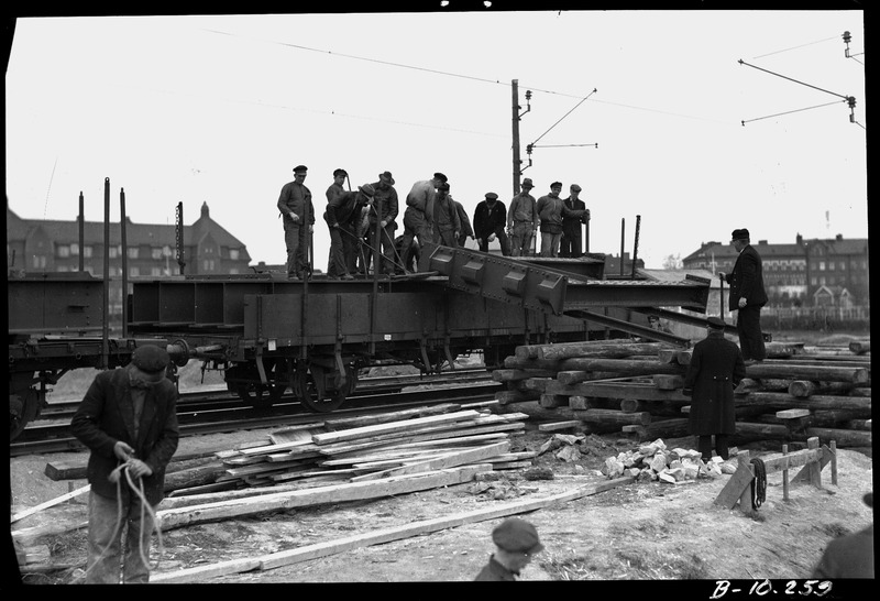 Byggande av järnvägsbro över Ringvägen. Lossning av järnkonstruktioner.