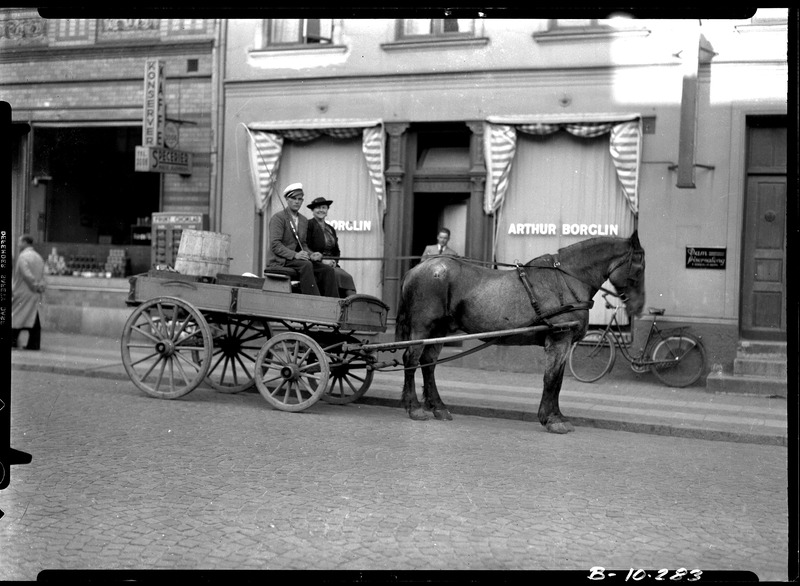 Grothéns bildsaml. Arthur Borglins köttaffär. Hästskjuts utanför affären.