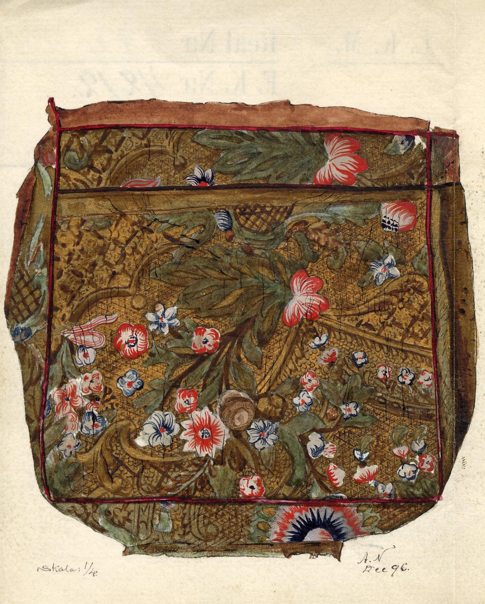 Med stiliserat blomster-, blad- och spaljémönster.