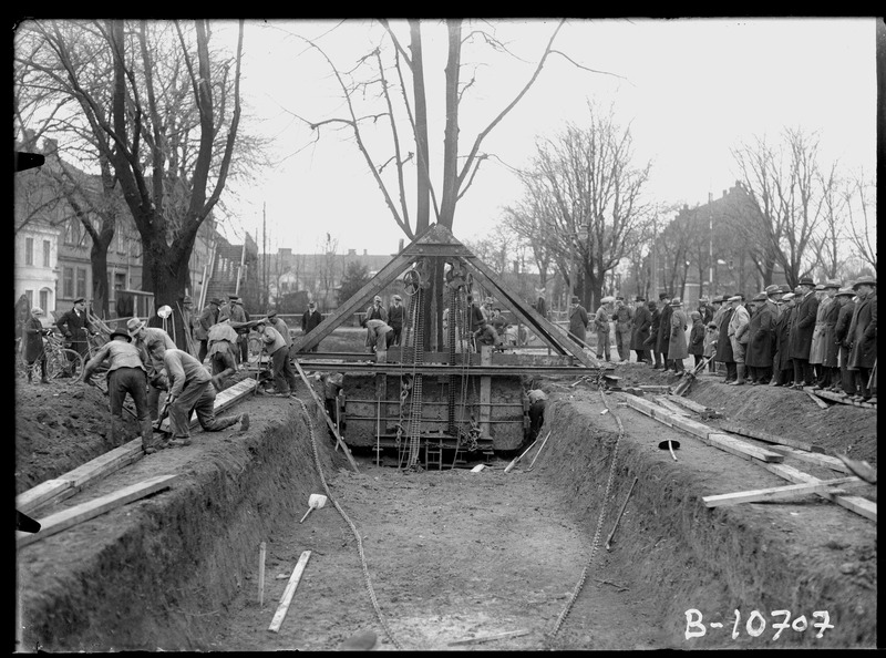Grothéns bildsaml. Flyttning av träd 1931 vid Bantorget. Sett från öster.