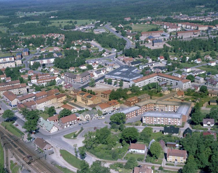 Flygbild. Bebyggelse, järnväg, skola. Perstorp.