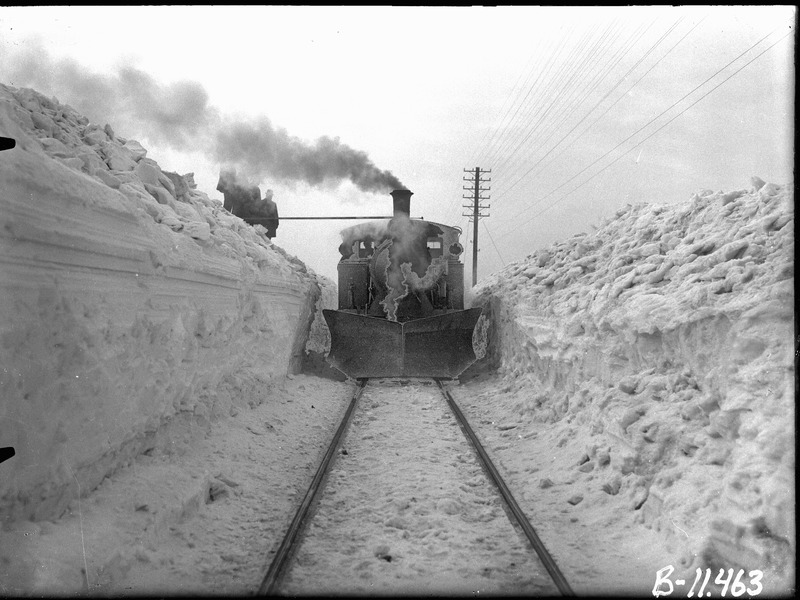 Grothéns bildsaml. Ånglok på spår mellan höga snövallar. Sett framifrån 1929.