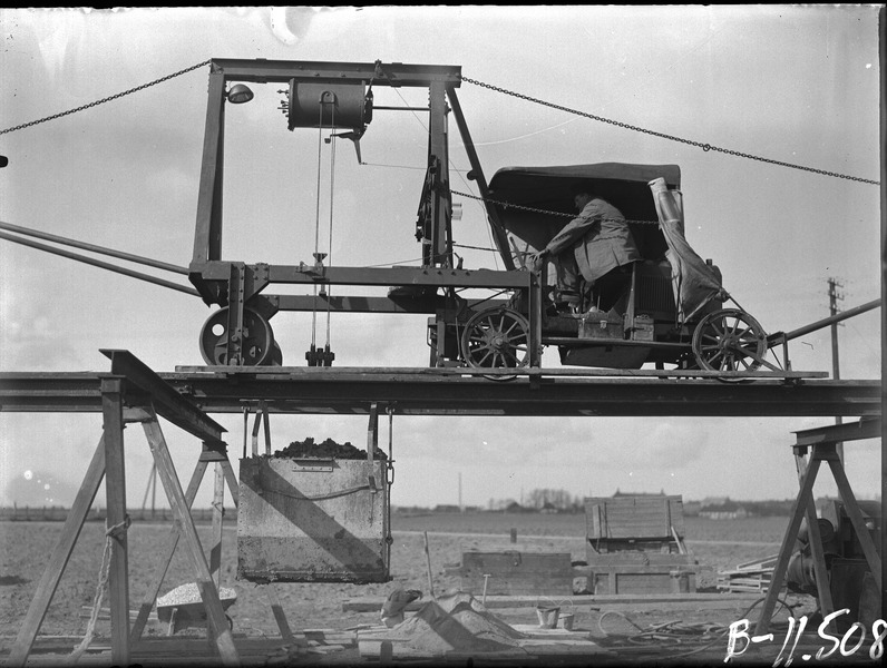 Grothéns bildsaml. Läggande av avloppsledning. Läggningsfordon hissas ner, tippvagn med mackadam.