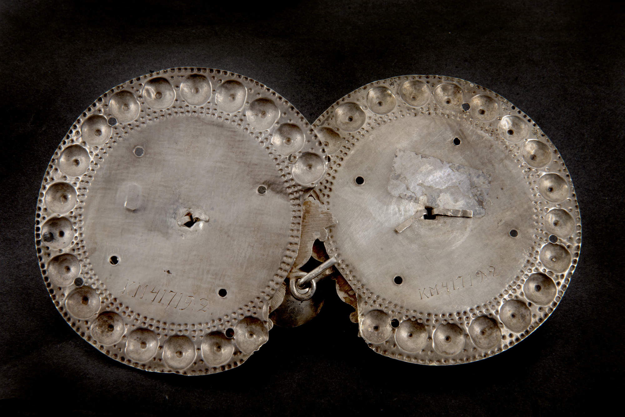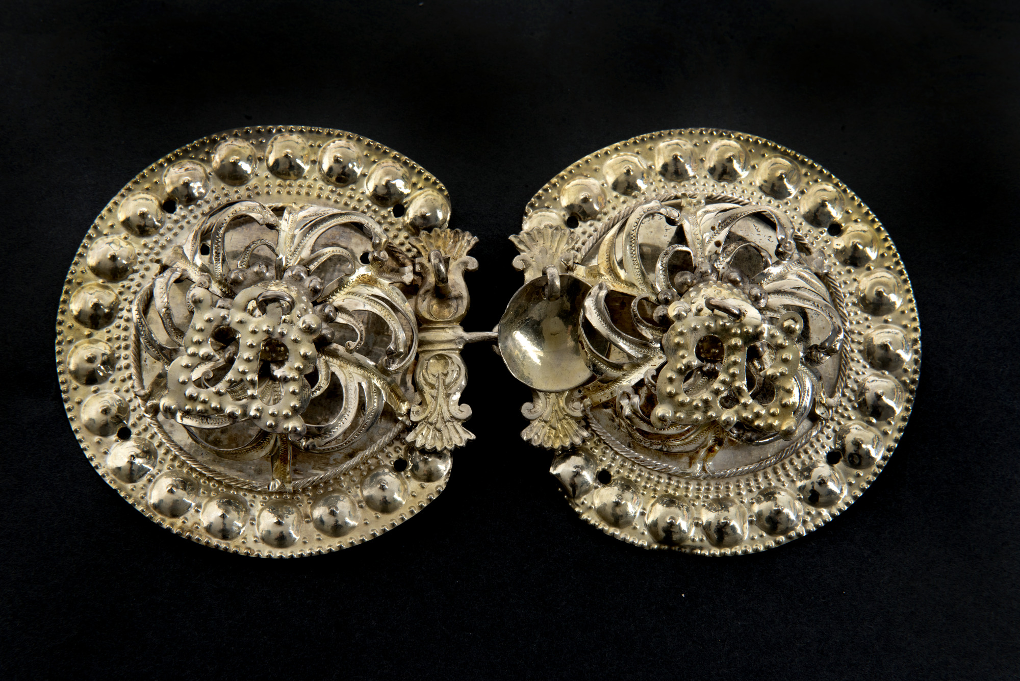 Framsidan förgylld. Bucklan består av en rund platta med upphamrad dekor på brättet; över plattans släta mittparti en genombruten buckla med blad; på dess topp en rund sköld med upphamrad knottrig dekor; en dibelten som gå igenom toppskölden, bucklan och plattan, har överst en ögla under plattan utslagna ändor och sammanhåller de olika delarna; i öglan hänger ett M (ett Maria- löv), vid knäppet blomdekor och två skålformiga löv, ett saknas.