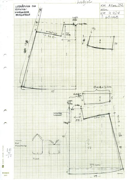 - Liv av varmröd silkesammet med kantbårder, dubbla på framsidan, av 2,5 cm bred guldgalon. Även sömmarna prydda med galon. Linnefoder, trasigt. Knäppt i midjan med en häkta. Kjol, 4 våder i grön vadmal, veckad i ca 1,5 cm djupa veck. 5,5 cm från kanten ett 2,5 cm brett vinrött taftband, nästan borta. Ficka i grovt linne. Skoning av rött skäftigt ylletyg. Maläten och fälld. Märke efter invikning i nederkanten.