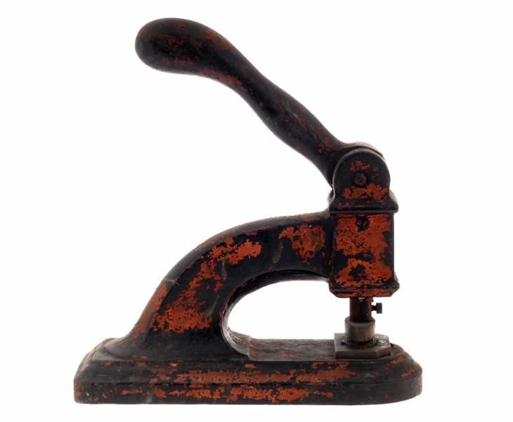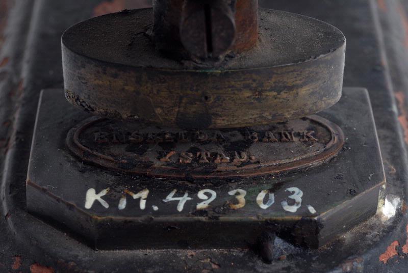 SKÅNES ENSKILDA BANK YSTAD, firmastämpel: C.FLASLEW och Cos Fabrik, KJØBENHAVN; spår av rödaktig målning.