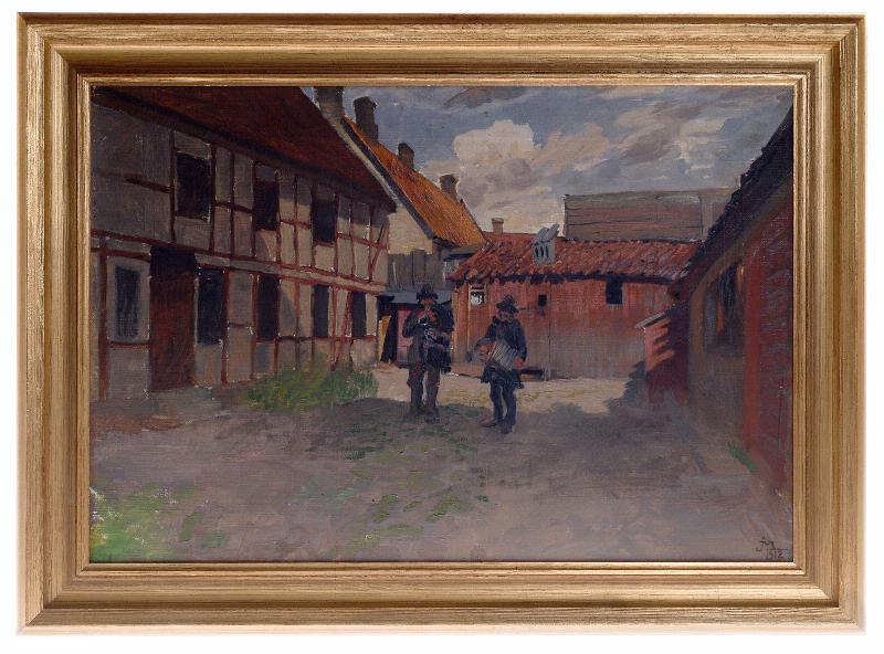 Två spelmän på en bakgård, korsvirkeshus till vänster, annan bygnad till höger, i fonden träskjul, husgavel och tak.