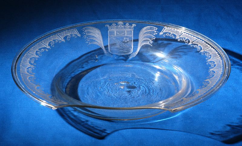- Cirkelrunt med ett sfäriskt urtag i brättet för att passa in omkring halsen på den som rakas, vulstkant, platt botten. Etsad dekor med lambrekäng (rutad kantbård) på brättet samt familjen Dagströms vapen, flankerat av palmkvistar.