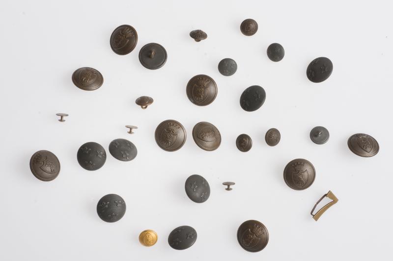26 lösa knappar [en saknas] till uniform från Södra skånska infanteriregementet, modell 23 eller senare. Förvarade i cigarrettask av märlet Matanzas No 208, Svenska Tobaksmonopolet.