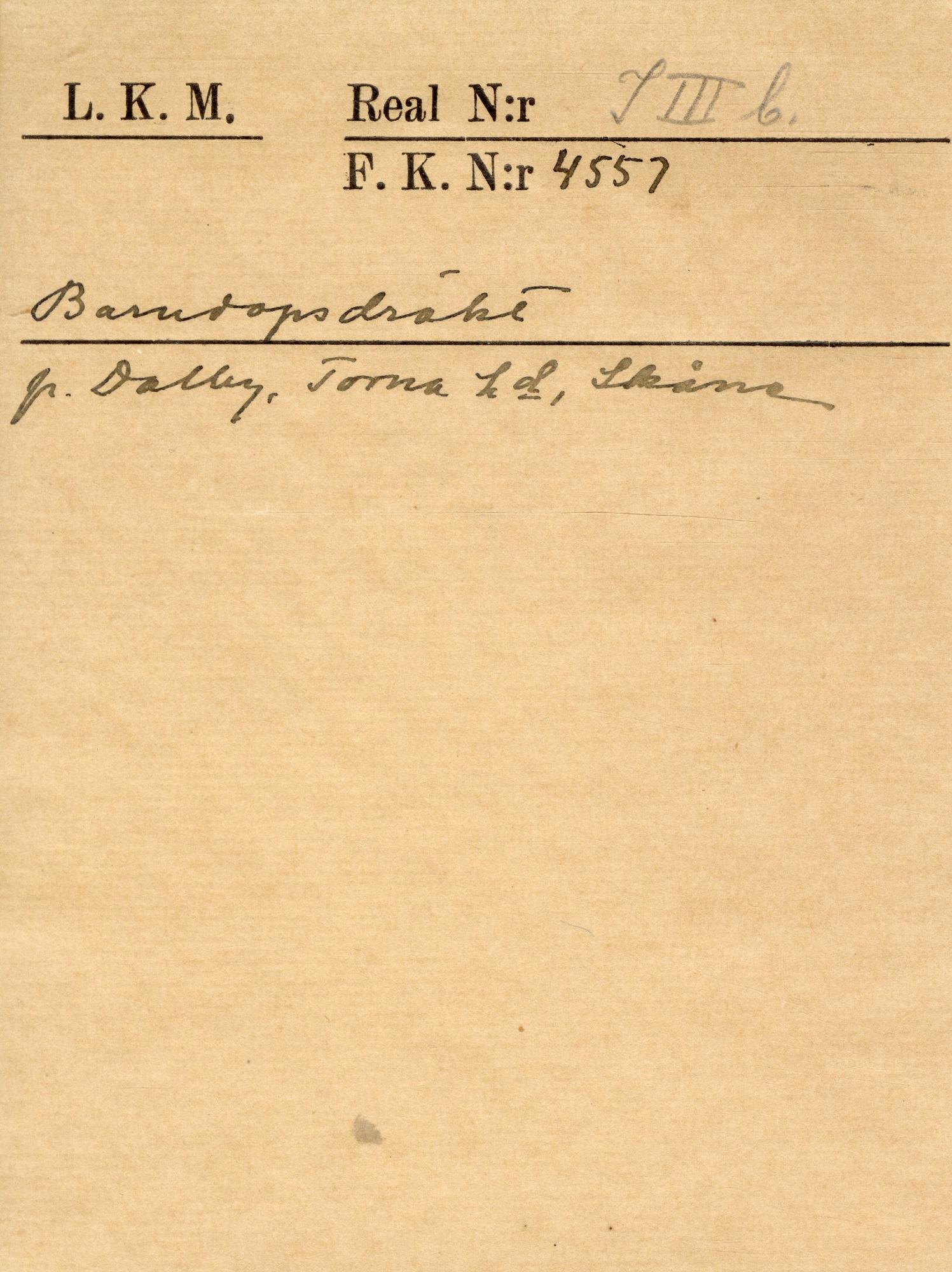 Rikt broderad med polykromt silke och silvertråd. Blommorna och bladrankorna utförda i schatterad plattsöm och kantade med silkesnoddar. Här och var blommor sydda av tenninfattade glasbitar. De flesta glasbitar är försvunna. Färgerna är blått, violett, gult, vitt, svart, från gulgönt till mörkgrönt. Sidentyget är rökgrått. Upptill ett stycke rödbrunt siden och kant av mossgrönt sidenband som knyts i nacken. Nertill en bred silvergalon och silverfrans. På baksidan varmgrönt ylletyg med ett stycke grönt siden upptill. Öppen nertill och kantad med rosa siden. Linnefoder. Broderiet är överflyttad från ett annat tyg. Silkesnoddarna ditsatta därvid.