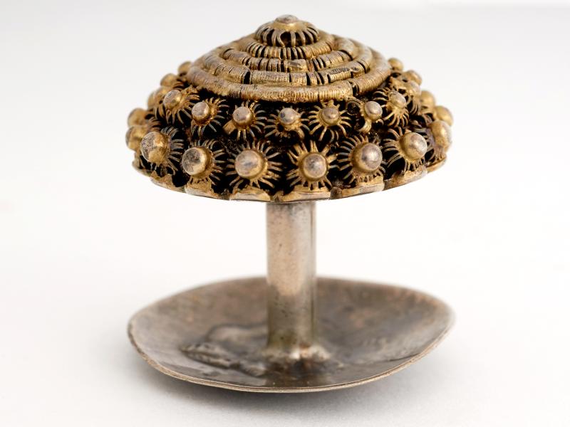 Rund, övre plattan med kupig, koncentrisk filigrandekor. Kraftig stolpe. Den undre plattan med två stämplar, samt graverade initialer "A.I.S." eller "A.J.S."