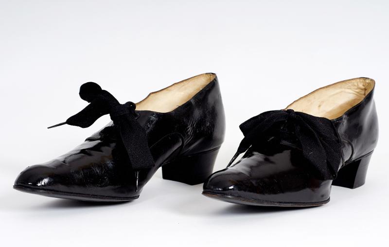Svart lackskinn. Knyts med svart ylleband, två par snörhål. Förlängd tå; vitt skinnfoder och bakkappa. Tåpartiet fodrat med vit bomull. Halvhög klack. Inuti firmastämplad: