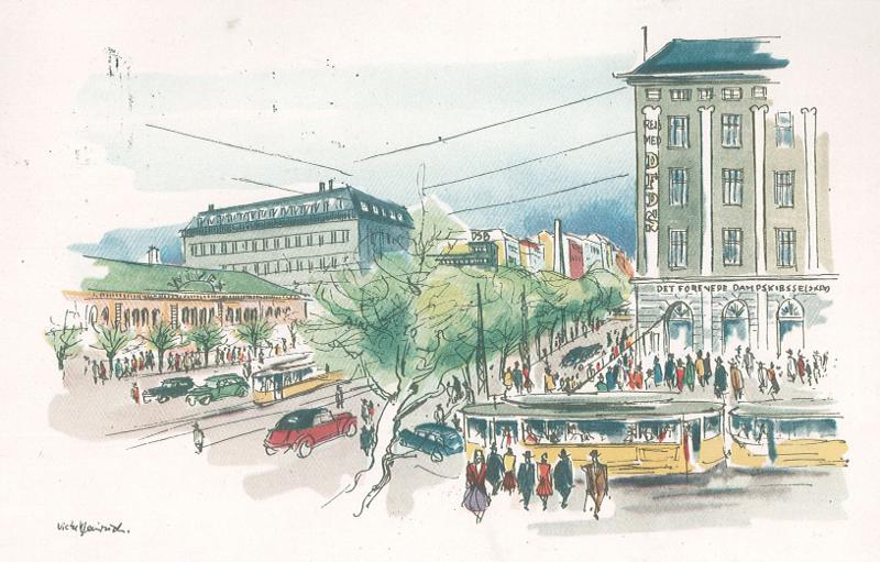 Motiv från Vesterbrogade, Köpenhamn, i färg, skrivet på danska