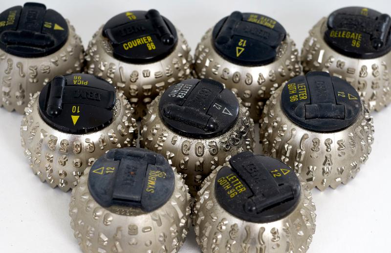 - Tillbehör till skrivmaskin IMB 196 c: nio skrivhuvuden med olika typsnitt (sex i plastaskar), två borstar (en blå och en vit), ett radéband med spole, ett färgband i vit pappask. De mindre föremålen i röd plastask.