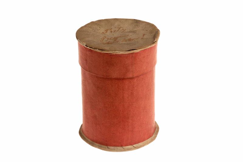- Cylindrisk ask av papper, med utanpåliggande lock. Utvändigt rosafärgat papper och invändigt, ovanpå locket och undertill vitt papper. På lockets ovansida handskrivet i brun (ursprungligen svart?) text "Fritz Beyer. ... ..." (de två sista orden är oläsliga). Asken ska enligt huvudliggaren innehålla ett dryckesställ av genombruten metall med två karafiner och tre glas, men detta saknas vid Sesaminventering, april 1998. Skador: pappret ovanpå locket börjar lossna i kanterna. Vårdåtgärder: rengjord med pensel.