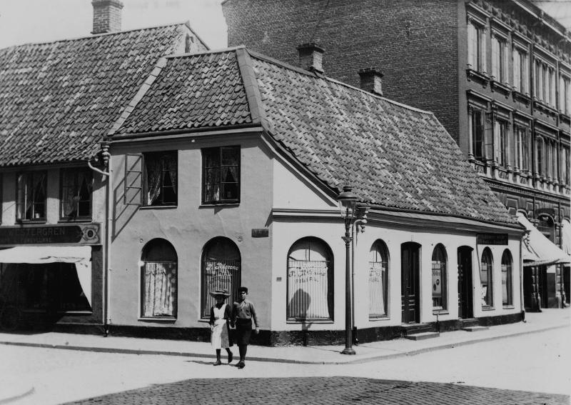 Lund. Doktor Ficks bildsamling. N.Ö. hörnet av Kloster- och St. Gråbrödersgatorna, 292 (6½x9). Pojke och flicka hållande varandra i handen, 1890-talet.
